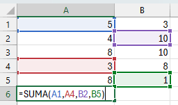 Por ejemplo si necesitas contar las celdas A1, A4, B2 y B5, =SUMA(A1,A4,B2,B5)