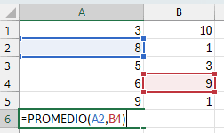 Por ejemplo si necesitas contar las celdas A2 y B4, =PROMEDIO(A2,B4)