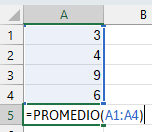 Para calcular la media de los valores de las celdas A1 a A4, escribirías =PROMEDIO(A1:A4)