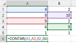 Por ejemplo si necesitas contar las celdas A1, A3, B2 y B4, =CONTAR(A1,A3,B2,B4)