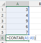 Para contar el número de celdas que contienen valores en las celdas A1 a A5, escribirías =CONTAR(A1:A5)